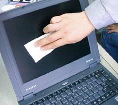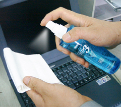 - Sử dụng một vài loại giấy hoặc loại vải mà không tạo ra bụi, dùng chai LCD-3 xịt vào bề mặt vải và chà để làm sạch màn hình.